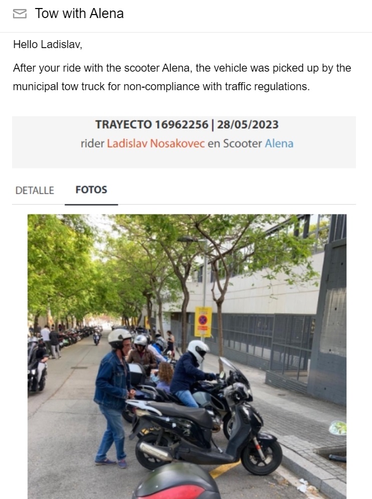 Druhý den mi pak v e-mailu přistálo info o tom, že mojí chuděru motorku Alenu odtáhli. Když teď koukám na fotku, co k tomu dopisu dali, tak je fakt, že tý žlutý čáry a značky se všimnout dalo.