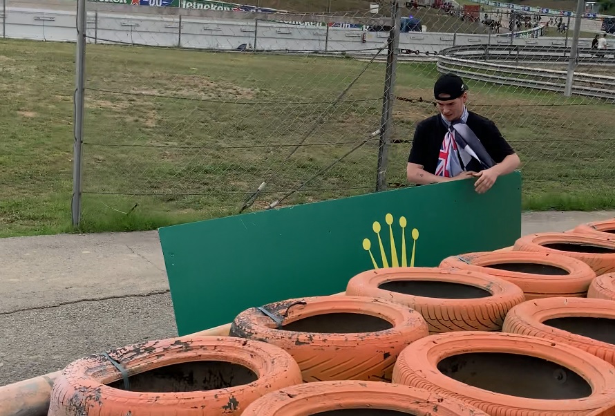Když závod skončil, všimnul jsem si jak jde pár mladejch kluků přelízt pletivo a běží rovnou na okruh. Nikdo jim v tom nebránil, tak jsem to dal taky. Zajímavej pocit, být na dráze pár minut potom, co skončil závod. Všude kolem seškvařený kusy gum, pár úlomků z okruhu, a pár dokonce i z formulí – to všechno tam lidi hledali a dávali do kapes. Někteří borci začali očesávat i ty obří reklamy typu Rolex nebo Heineken. Bralo se úplně všechno!