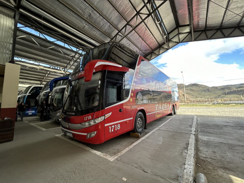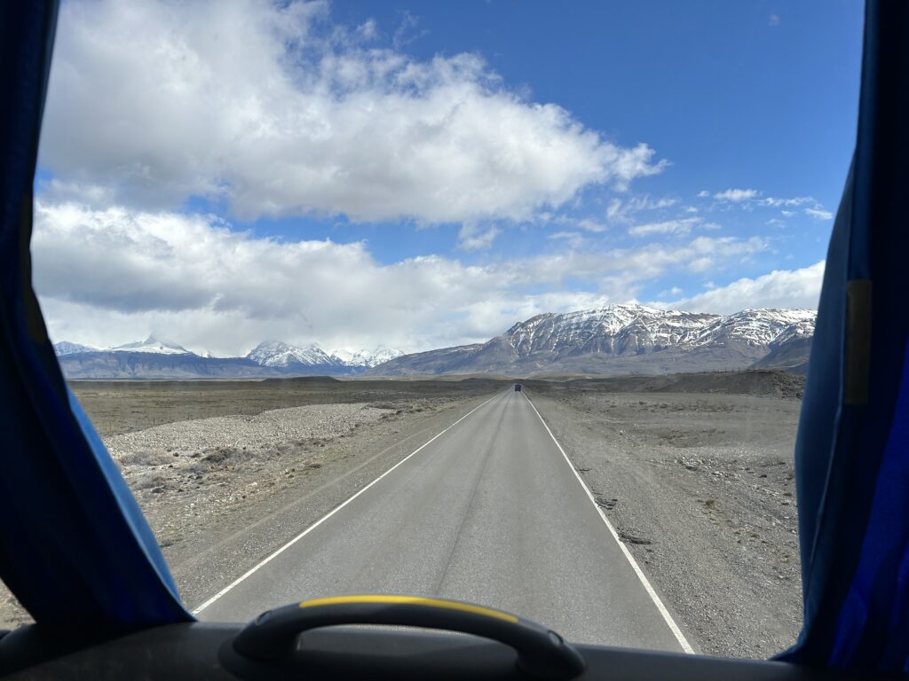 Místo toho nás čekala parádní cesta neskutečně krásnou krajinou. Seděli jsme v druhém patře hned v první řadě (další důvod, proč jsem zrovna tenhle bus chtěl stihnout) a měli celou tuhle podívanou jako na dlani. Úplně v dáli zasněžené pohoří And, jinak ale nekonečné pláně a pustoprázdno. Sem tam nějaké jezero, jinak nic.