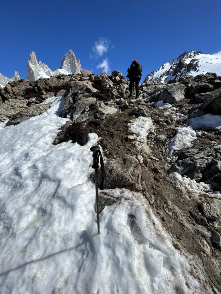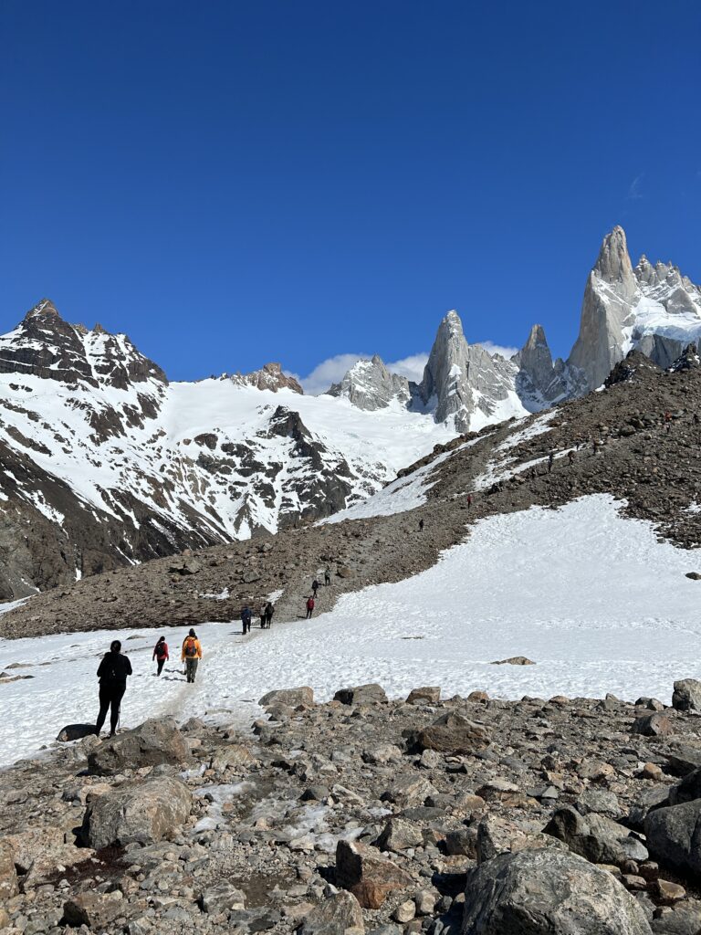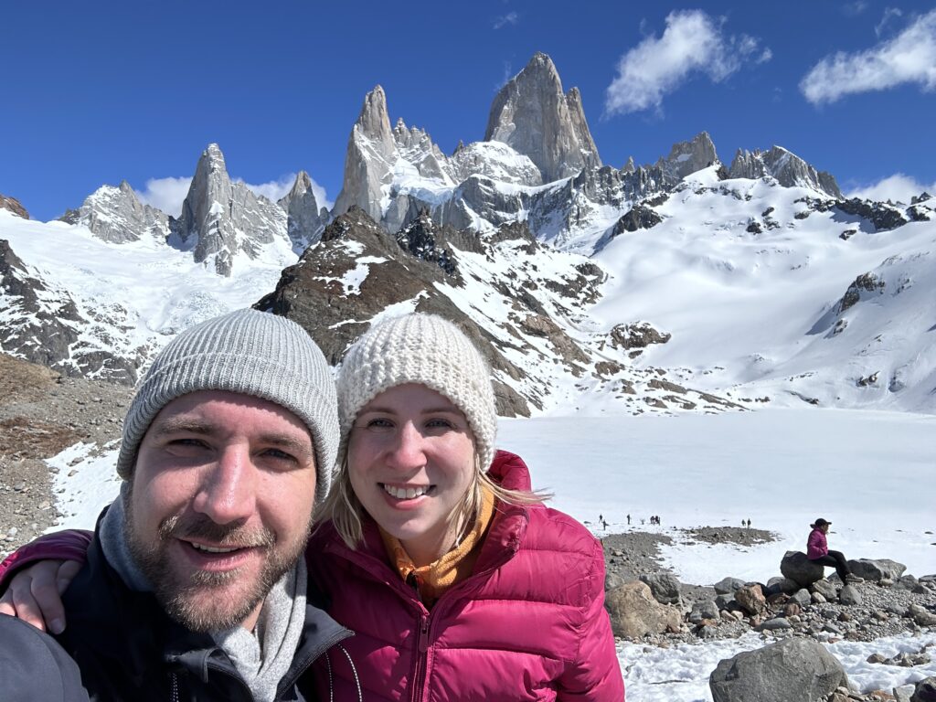 Ikonická Laguna Tří je zamrzlá a pod sněhem, ta tam je její azurová barva. Hehe, to nám jaksi nedošlo. Ale výhled na Mt. Fitz Roy máme znamenitej. Nebe skoro bez mráčku.