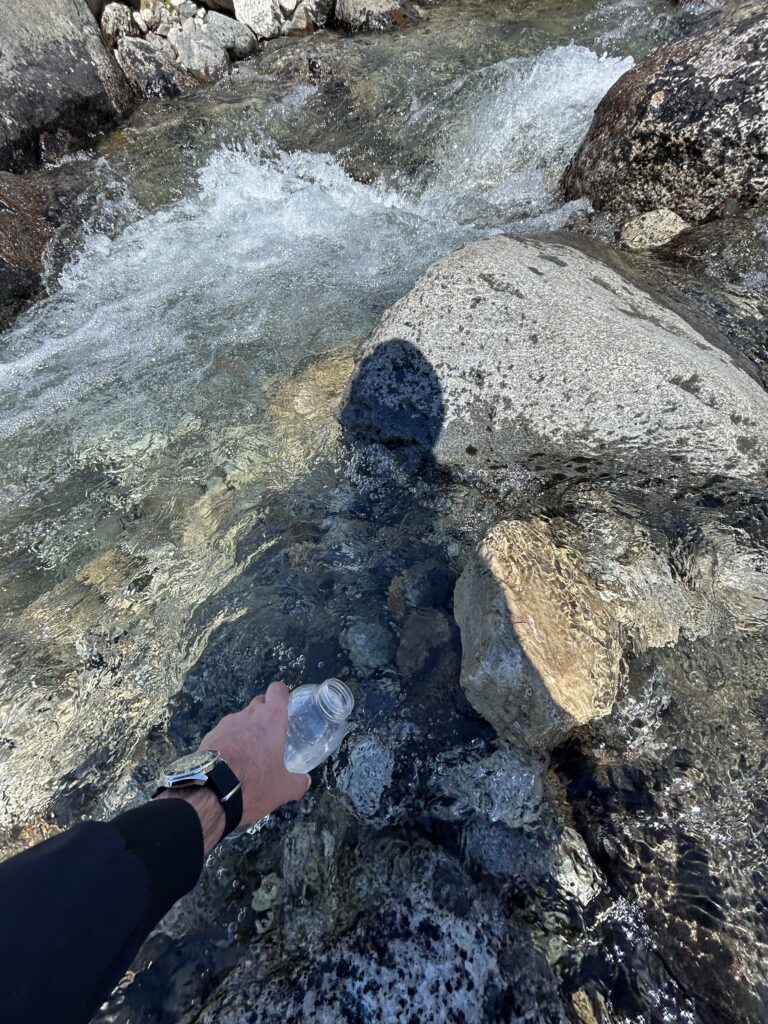 Nabíráme do lahve vodu přímo z ledovce a připravujeme se na poslední kilometr. Ten má převýšení 400 metrů, tedy na každý ujitý metr půl metru do kopce. Taky už se objevuje první sníh. Nasazuji ty těžký boty, co vláčím celou dobu na zádech. Váží snad tunu. Každej krok je cejtit, kort tady. Chodit v nich je fakt utrpení…