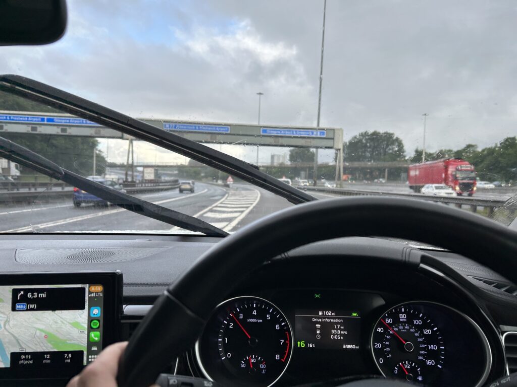 Pršelo pak už celou cestu do Glasgow. Celý tři a půl hodiny. Mám odtud ranní let do Barcelony, tak tam chci být raději už noc předem. Zpátky do Barcelony musím na čtyři dny pracovně na konferenci. Marťa jede do Glasgow se mnou, protože si chce druhý den prohlídnout město. Pak zůstane ve Skotsku několik dní sama a potkáme se až v naší další destinaci. Takovej je od začátku plán a jinak to bohužel udělat nejde.